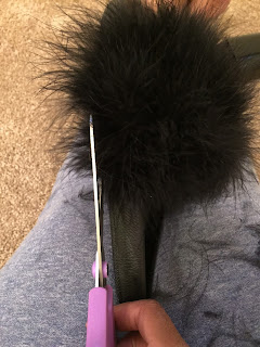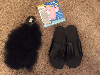 First step is to plug in and heat up your glue gun, then cut off excess yarn/string from your boa. Second, once your glue gun is hot you will need to line the front of your slide sandal with hot glue. Once done quickly lay the first row of boa onto the glue.